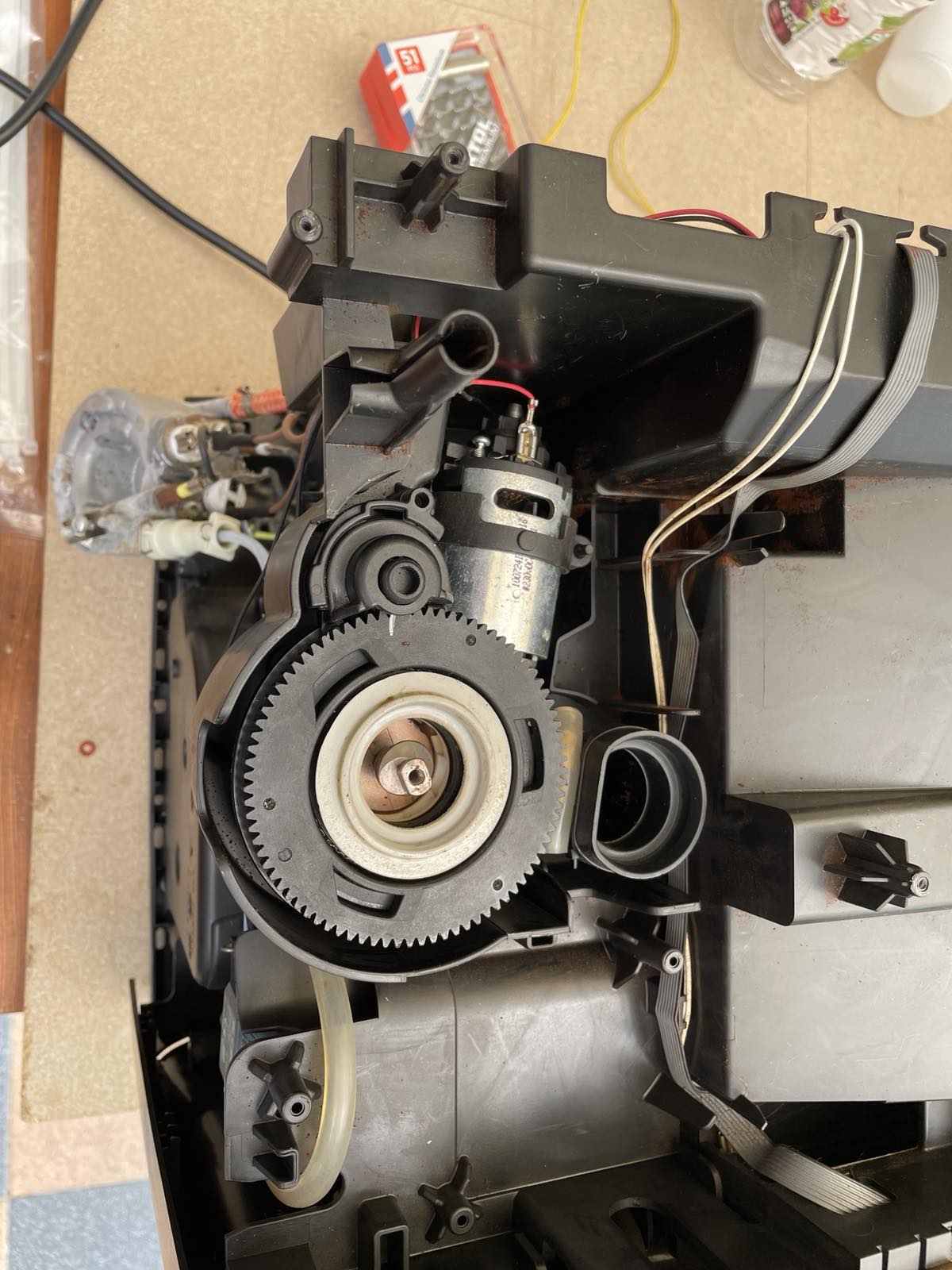 A gépet teljesen szétszereltük, a főzőegység, vízrendszer és burkolatok eltávolításával.