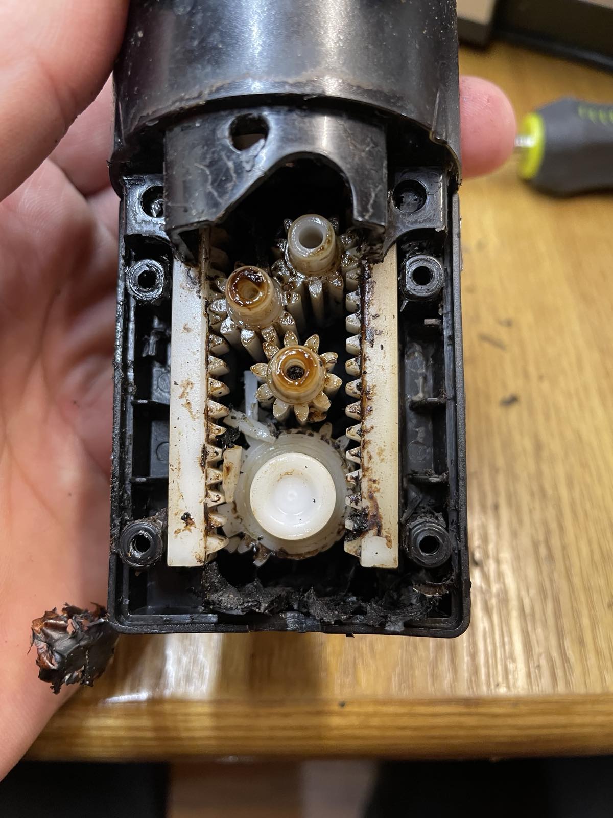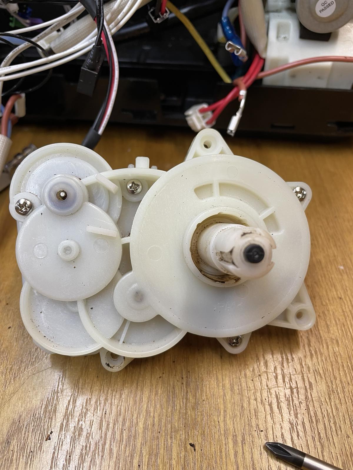 A pozícionáló motor szétszerelésre került, majd alapos tisztítás, zsírtalanítás és új kenőanyag felvitele történt. A motor újra precízen, csendesen és simán működik, a főzőegység mozgása stabil.